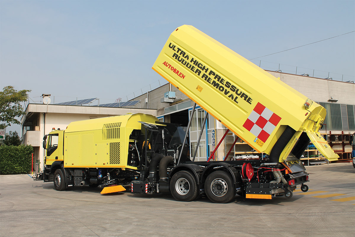 UHP RUBBER REMOVAL after years of experience in the business of airport and road sweepers, takes a step forward and introduces, into its production, a new equipment destined to remove the rubber from runways and to remove the horizontal markings. Thanks to the use of a rubber removal system capable of exceeding 3.000 bar of pressure and a working width of 2.500 mm, the TSG series boasts record breaking features and ranks among the first places in terms of quality, efficiency and work speed.